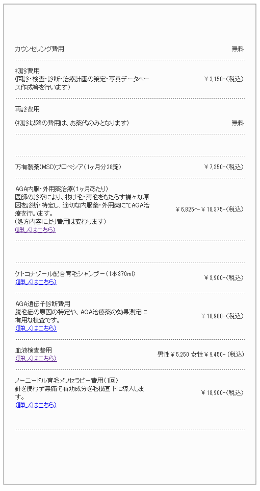 薬代金は、7,020〜18,900円となっています。恐らく一番安い金額は、プロペシア単独での治療と思われます。金額が高くなるに連れてミノキシジルや他の飲み薬もプラスされていきます。従って、薄毛の進行が激しいほど金額が高くなります。