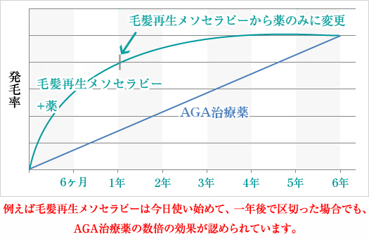 例えるのであれば、毛髪再生メソセラピーは薄毛治療の特急券です。 薬の治療では薄毛が改善するのに2?6年かかりますが、毛髪再生メソセラピーは半年から12ヶ月で劇的な効果をもたらします。 13,000件の症例数が何よりの証拠です。 髪が増えてしまえば、後は薬で毛量を維持する事ができます。 薄毛を改善したいなら、当院で行っている毛髪再生メソセラピーを自信をもっておすすめします。